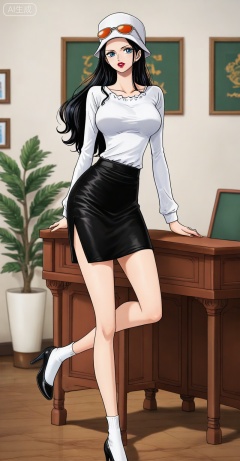 1girl,solo,breasts,looking at viewer,skirt,shirt,long sleeves,hat,standing,white shirt,socks,indoors,black skirt,black footwear,high heels,shadow,white headwear,table,standing on one leg,white socks,desk,pencil skirt,red lips,shirt tucked in,