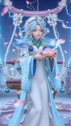 Dish hair, petals, sparkling lightning background, light blue phantom background, light blue lightning, halo, surrounding lightning, crystal bead curtain background, blueberry ocean.