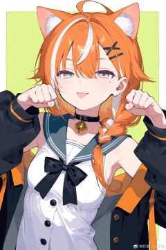 1girl,animal ears,tongue,solo,neck bell,tongue out,bell,hair ornament,sailor collar,green background,paw pose,collar,braid,upper body,looking at viewer,bow,hairclip,multicolored hair,mole under eye,weibo username,collarbone,jacket,hair between eyes,streaked hair,animal ear fluff,sleeveless,shirt,black collar,long hair,white hair,x hair ornament,bowtie,off shoulder,orange hair,blue sailor collar,ahoge,weibo logo,cat ears,black bow,black jacket,long sleeves,mole,open clothes,white shirt,buttons,:p,hair over shoulder,single braid,sleeveless shirt,eyelashes,choker,simple background,open jacket,black bowtie,bare shoulders,white border,hands up,grey sailor collar,breasts,black choker,jacket partially removed,half-closed eyes,jingle bell,two-tone background,grey eyes,virtual youtuber,<lora:蓝色苏醒:0.7>,