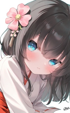 masterpiece,highres,absurdres,newest,best quality,high quality,loli,petite,chromatic_aberration,//,1girl, solo, japanese clothes, blue eyes, white background, black hair, red hakama, hakama, hair ornament, closed mouth, looking at viewer, flower, miko, simple background, white kimono, hakama skirt, kimono, hair between eyes, skirt, hair flower, signature, upper body, pink flower, medium hair, long sleeves, looking to the side//,<lora:guizhencao1114——【noob】hans:1>,