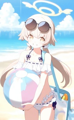 masterpiece,highres,absurdres,newest,best quality,high quality,loli,petite,chromatic_aberration,//,1girl,swimsuit,bikini,solo,hifumi_\(blue_archive\),white_bikini,ball,eyewear_on_head,twintails,outdoors,beachball,halo,beach,frilled_bikini,frills,holding_ball,side-tie_bikini_bottom,smile,low_twintails,sunglasses,day,long_hair,holding,yellow_eyes,light_brown_hair,ocean,collarbone,sky,bag,sand,off-shoulder_bikini,official_alternate_costume,cloud,blue_sky,looking_to_the_side,holding_beachball,breasts,shoulder_bag,off_shoulder,bare_shoulders,water,grin,sparkle,round_eyewear,ribbon_trim,//,<lora:ba33——【noob】hans:1>,