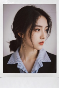 拍立得风格肖像,人物留着乌黑头发(一侧盘成松散发髻,带些碎发自然感),内搭蓝白条纹衬衫,外穿深色上衣,背景为简洁浅色调。整体画面带有拍立得特有的颗粒感与复古柔和色调,氛围清新文艺,写实中透着胶片质感人