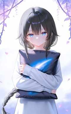 1girl,solo,long_hair,object_hug,pillow_hug,pillow,bangs,long_sleeves,closed_mouth,very_long_hair,hair_between_eyes,upper_body,looking_at_viewer,sleeves_past_wrists,masterpiece,best quality,high quality,(colorful),nai3 Style,loli,white background,Dundar effect,a lot of purple vines,vines covering half of the painting,delicate plant details,a girl,petite girl,sad eyes,light,figure light,petals,purple filter,left,fog,dream,unreal,Blur,float light,mole,single_braid,