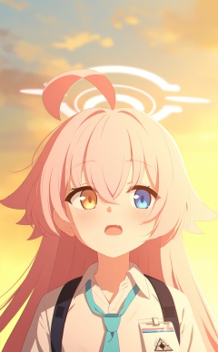 masterpiece,highres,absurdres,newest,best quality,high quality,loli,petite,chromatic_aberration,//,1girl,hoshino_\(blue_archive\),solo,shirt,ahoge,halo,heterochromia,necktie,blue_eyes,white_shirt,collared_shirt,pink_hair,long_hair,yellow_eyes,fang,open_mouth,hair_between_eyes,blue_necktie,pink_halo,upper_body,harness,chest_harness,looking_to_the_side,looking_afar,outdoors,huge_ahoge,blush,shoulder_strap,id_card,skin_fang,hair_flaps,strap,sunset,crossed_bangs,//,<lora:ba44——【noob】hans:1>,
