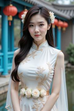 A photograph of a young Asian woman with fair skin, long dark hair adorned with white flowers, and delicate facial features. She wears a traditional white Chinese cheongsam dress with gold embroidery and sheer sleeves. The dress has a floral belt. The background features a vibrant blue wooden structure with red lanterns, and a serene water body reflecting the scene. The overall aesthetic is elegant and traditional.