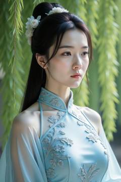 This is a photograph of a young East Asian woman with fair skin, long black hair styled in an elegant updo adorned with small white flowers. She wears a light blue, intricately embroidered traditional Chinese cheongsam with sheer, flowing sleeves. Her expression is serene and contemplative. The background features lush, green willow branches hanging down, creating a natural, serene atmosphere. The soft lighting enhances the ethereal quality of the scene.