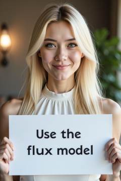 instagram photo, closeup face photo of 20 y.o, blue eyes, pale skin, smirk, blonde long straight hair, white halter neck dress, holding a sign with text "Use the flux model",
