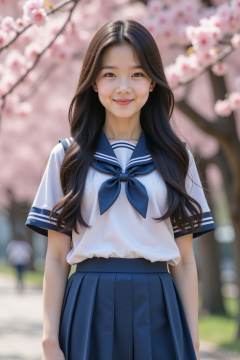 HDR photo of cinematic film still, young girl,school uniform,blue skirt,smile,solo,long hair,looking at viewer,peach tree,peach blossom,petals,closed mouth,