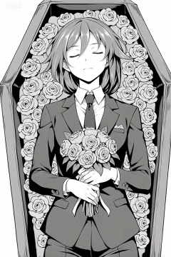 looking at viewer,,1girl, fu hua, bed of roses, bouquet , closed eyes , closed mouth, collared shirt, flipped hair , flower, formal clothes, funeral, hair between eyes, holding, holding bouquet, implied death, jacket, long sleeves, female focus, necktie, shirt, upper body, coffin, lying in the coffin,monochrome,greyscale,manga_style