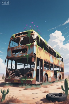 数字动漫风格,数字动漫风格的插画,描绘了一辆废弃在荒野中的双层巴士,整体画面充满末世废土与自然重生的强烈对比感。