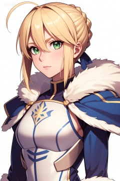 1girl, solo, blonde hair, artoria pendragon (fate), green eyes, , white background, hair between eyes, ribbon, armor, blue ribbon, fur trim, hair ribbon, bangs, ahoge, simple background, closed mouth, braid, short hair,full_body
