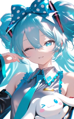 masterpiece,highres,absurdres,newest,best quality,high quality,loli,petite,chromatic_aberration,//,1girl, cinnamoroll, bow, hatsune miku, necktie, detached sleeves, shirt, updo, heart, looking at viewer, hair bow, blue bow, collared shirt, white background, upper body, one eye closed, aqua eyes, sleeveless, hair between eyes, ear bow, simple background, aqua necktie, >_o, aqua hair, open mouth, sleeveless shirt, grey shirt, black sleeves, smile, hand up, polka dot, bare shoulders, blue necktie, aqua bow, blue eyes, blue hair, matching outfits, :3, hatsune miku \(cosplay\), frilled shirt, hair ornament, long hair, parted lips, polka dot bow//,official art,depth of field,detailed light,blurry background,cinematic lighting,ray tracing,ultra detailed,god rays,backlighting,photo background,film grain,chromatic aberration,volumetric lighting,depth of field,blurry background,shiny skin,floating hair,cinematic lighting,day,very aesthetic,//,<lora:MAQ1118——【noob】hans:0.8>,