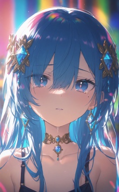 masterpiece,highres,absurdres,newest,best quality,high quality,loli,petite,chromatic_aberration,//,illustration,ultra detailed,hdr,Depth of field,(colorful),loli,1girl,solo,long hair,hair ornament,collarbone,looking at viewer,blue eyes,jewelry,parted lips,hair between eyes,earrings,bare shoulders,portrait,mole under eye,blue hair,mole,tears,//,<lora:konya_karasue3——【noob】hans:0.7>,