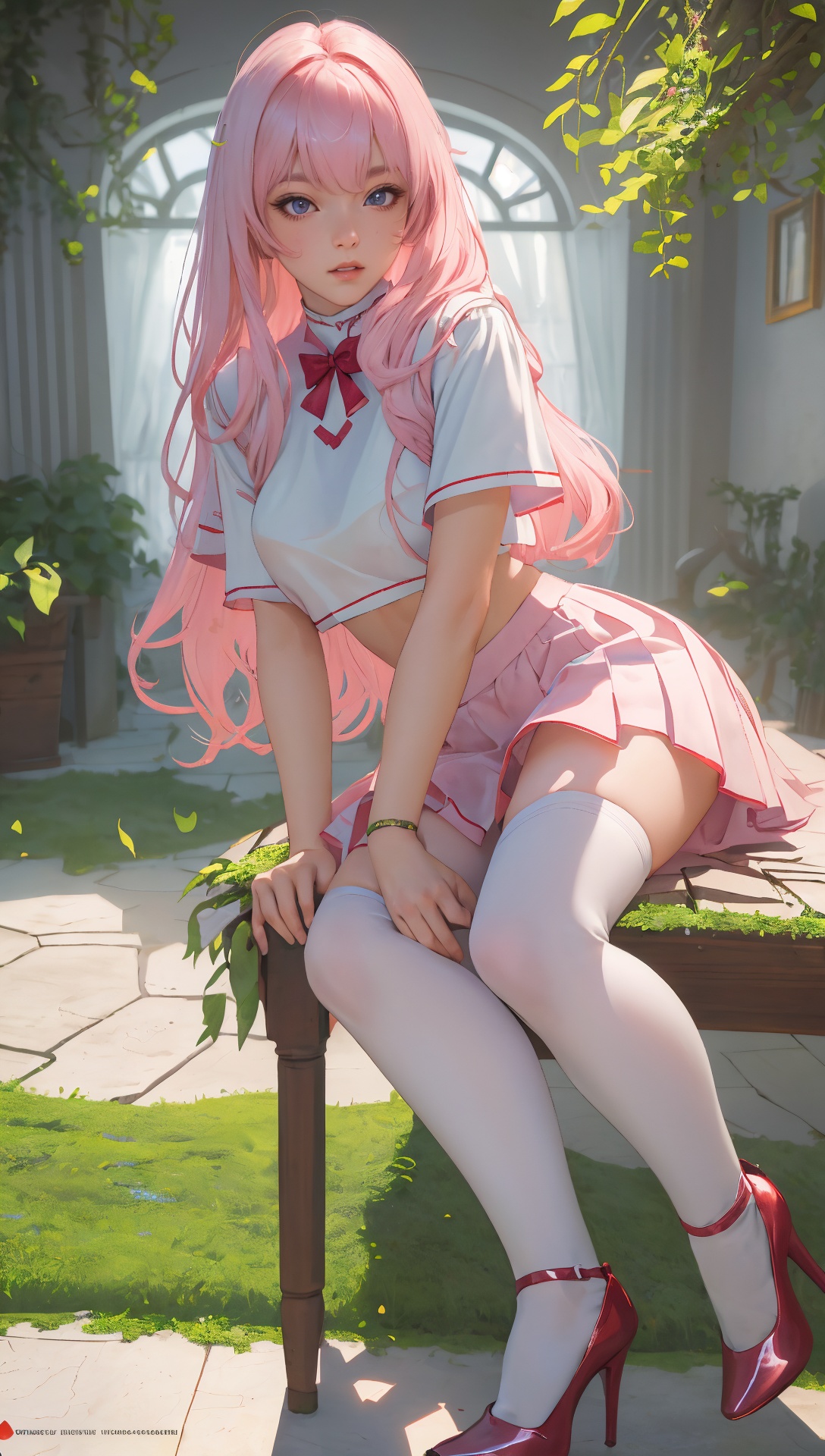 粉发少女梦幻微笑白T恤浅粉百褶裙 - 模型强度0.85-1.5