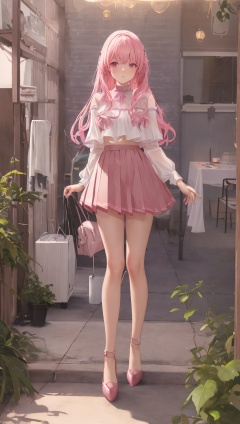粉发少女梦幻微笑白T恤浅粉百褶裙 - 模型强度0.85-1.5