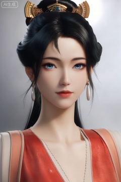 MPL,1girl, solo, looking at viewer, blue eyes, black hair,hair ornament, dress, jewelry, upper body, earrings, black eyes, lips, red dress,