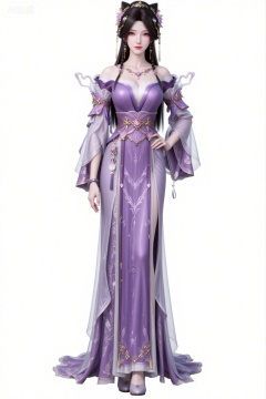 jiziyue,1girl,solo,jewelry,dress,full body,white background,bracelet,purple dress,necklace,long hair,simple background,bare shoulders,breasts,black hair,standing,anklet,side slit,chinese clothes,collarbone,off shoulder,