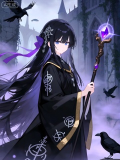 这张数字动漫风格的插图描绘了一个神秘的年轻巫女,她有着乌黑亮丽的长发,如瀑布般垂落在身后,发间点缀着银色的符文发饰,还有一条紫色的丝带随风飘动。她有一双深邃幽蓝的眼睛和冷峻的表情。她身着传统的黑色巫女长袍,长袍上绣着神秘的白色符文和图案,袖口和领口处镶嵌着金色的边饰。她右手拿着一根镶嵌着紫色宝石的法杖,法杖顶端闪烁着神秘的光芒。背景是阴森的古老城堡,墙壁上爬满了藤蔓,周围弥漫着淡淡的紫色雾气,还有几只黑色的乌鸦在盘旋。她的头发和法杖充满神秘的气息,动作沉稳,为图像增添了神秘莫测的感觉。整体风格神秘深邃,细节丰富。