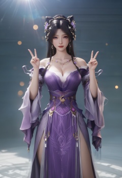 (score_9),1girl,solo,<lora:姬紫月-Apony-000008:0.83>,jiziyue,jewelry,hair ornament,black hair,hair flower,long hair,double bun,braid,earrings,off-shoulder dress,purple dress,necklace,purple eyes,waist belt,collarbone,cleavage,large breasts,BREAKsolo focus,cowboy_shot,front view,eye-contact,looking_at_viewer,(double v),<lora:e肤色滑块:0.8>,(light_skin),(white_skin),BREAKsimple background,depth of field,lens_flare,bokeh,