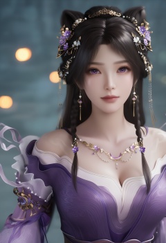 (score_9),cute,1girl,solo,<lora:姬紫月-Apony:0.85>,jiziyue,jewelry,hair ornament,black hair,hair flower,long hair,double bun,braid,earrings,off-shoulder dress,purple dress,necklace,purple eyes,waist belt,collarbone,cleavage,large breasts,BREAKsolo focus,upper body,front view,<lora:e肤色滑块:0.8>,(light_skin),(white_skin),BREAKsimple background,depth of field,lens_flare,bokeh,