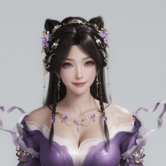 (score_9),light smile,1girl,solo,<lora:姬紫月-Apony:0.8>,jiziyue,jewelry,hair ornament,black hair,hair flower,long hair,double bun,braid,earrings,off-shoulder dress,purple dress,necklace,purple eyes,collarbone,cleavage,large breasts,BREAKsolo focus,upper body,front view,(light_skin),(white_skin),BREAKsimple background,white background,