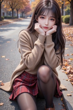 Masterpiece, the best quality, high quality, huge breasts, (black hair: 1.4), (super long legs: 1.3), (thin legs: 1.4), 1girl, realistic style, slightly overhead perspective, daily snapshot style, not carefully composed or lit, clear, young and elegant beauty, pure lust, fair skin, idol temperament, a 19-year-old Asian beauty, big eyes, high nose bridge, fair skin, cold white skin. She has long black and brown hair, wearing a khaki knitted sweater jacket, paired with a dark red plaid jk skirt, brown thick leggings, brown Mary Sue leather shoes, sitting on the asphalt road, maple leaves, fallen leaves, sitting on the curb, dragging her chin with her hands, taking a full body photo, with a cute expression.