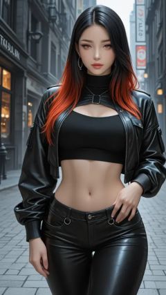 A beautiful busty Asian woman. high tech fantasy background. She's strutting with a badass attitude. High Detail natural light harsh shadows. Detailed texture. Edgy urban outfit