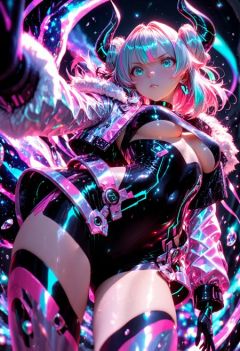 she has large dark horns, teal eyes, silver (half-up half-down hair), and a cosmic outfit with fur trim, choker, underboob, purple and pink hues at twilight, qxys, dynamic pose, Smooth_Quality, SmoothNoob_Quality, solo, 1girl