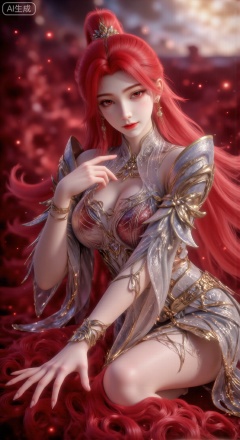 *Core Subject**: Huo Yun'er from the Chinese anime "Bailian Cheng Shen" (Tempered into a God), with bright crimson hair tied high in a ponytail and adorned with a magnificent golden hair crown; a red floral ornament at the outer corner of her eye, delicate red lips, lying on her side in a lazy posture, with an expression that blends charm and valiance.