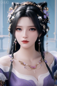 JZY,1girl, solo, long hair, looking at viewer, black hair, hair ornament, dress, jewelry, closed mouth, upper body, braid, flower, earrings, necklace, expressionless, hair rings, realistic, red lips,