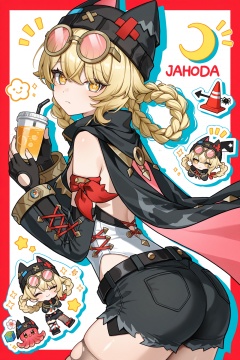 1girl,::,__artist__,year 2024,(drop shadow:1.4),(close-up:0.8),(shadow:1.2),(hands up:1.2),(border:1.2),(outside border:1.2),(hand up:1.2),(character name:1.2),from side,hand up,closed mouth,upper body,high contrast,holding cup,frown,looking at another,looking at viewer,rope,portrait,drop shadow,sparkle,^ ^,flag,moon,bug,notice lines,cloud,spider,traffic cone,star \(symbol\),circle,silk,traffic light,arrow \(symbol\),spider web,blonde theme,sun,cube,crescent moon,flower,sunlight,colorful,very awa,masterpiece,best quality,newest,highres,absurdres,chibi octopus,<lora:Jahoda-noob-Tanger-000012:0.8>,Jahoda,clothes: Jahodadef suit,Jahodadef black hat,Pentagon-shaped pupils,1girl,torn single thighhigh,gloves,braid,torn clothes,fingerless gloves,yellow eyes,round eyewear,shorts,belt,black gloves,cape,blonde hair,from behind,ass,looking back,