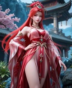 (oriental architecture, elegant decor, sophisticated style:1.1),Legs apart, one hand on her hip and the other raised as if holding a bow, she channels the spirit of a legendary warrior,(breasts:1.2),<lora:XL16完美世界戚琳:0.95>,miss qilin,red dress,red eyes,red hair,very long hair,hair ornament,traditional chinese updo with long front strands,earrings,jewelry,red bra,bare shoulders,choker,sash,, zPDXL2, score_9, score_8_up, score_7_up BREAK realistic, masterpiece,best quality, highly detailed,, zPDXL3, zPDXL2,zPDXL, zPDXLxxx, zPDXLrl,