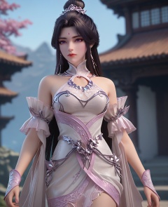(oriental architecture, elegant decor, sophisticated style:1.1),standing,(breasts:1.2),<lora:XL16完美世界月婵:0.95>,miss yuechan,solo,pinkish white corset,sash,pinkish white sheer fabric skirt,purple eyes,forehead jewel,traditional chinese updo,black hair,very long hair,hair ornament,bare shoulders,detached sleeves,wristband,, zPDXL2, score_9, score_8_up, score_7_up BREAK realistic, masterpiece,best quality, highly detailed,, zPDXL3, zPDXL2,zPDXL, zPDXLxxx, zPDXLrl,