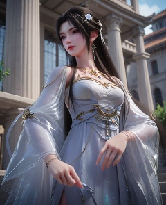 (oriental architecture, elegant decor, sophisticated style:1.1),Standing near a window, gazing outside with a wistful expression,,(breasts:1.2),<lora:XL16完美世界清漪:0.95>,miss qingyi,white dress,forehead mark,black hair,hanging hair,long hair,hair ornaments,gem earrings,gold jewelry,necklace,see-through sleeves,sash,hair ribbon,bracelet,floral print,, zPDXL2, score_9, score_8_up, score_7_up BREAK realistic, masterpiece,best quality, highly detailed,, zPDXL3, zPDXL2,zPDXL, zPDXLxxx, zPDXLrl,