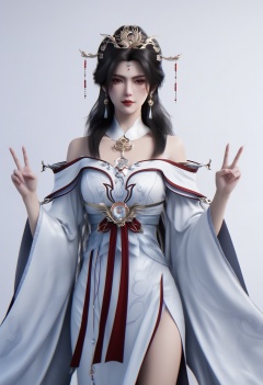 (score_9),(mature_female),collarbone,<lora:姚惜雪-Apony-000009:0.85>,long hair,black hair,hair ornament,hair beads,jewelry,forehead jewel,tassel earrings,light makeup,tiara,red eyes,mole under eye,detached collar,golden necklace,off-shoulder dress,narrow waist,waist_belt,waist_sash,bare legs,pelvic curtain,BREAKsolo focus,looking at viewer,front view,cowboy shot,(double v),<lora:e肤色滑块:0.8>,(white_skin),BREAKsimple background,white background,