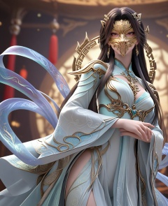 (oriental architecture, elegant decor, sophisticated style:1.1),Arms crossed over the chest,,(breasts:1.2),<lora:XL16完美世界狠人大帝:0.95>,miss henren,white high-slit corset gown,brown eyes,black hair,very long hair,long front strands,earrings,jewelry,wide flowing sleeves,hagoromo,bronze mask,, zPDXL2, score_9, score_8_up, score_7_up BREAK realistic, masterpiece,best quality, highly detailed,, zPDXL3, zPDXL2,zPDXL, zPDXLxxx, zPDXLrl,