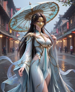 (oriental architecture, elegant decor, sophisticated style:1.1),Standing on a city street, holding an umbrella in the rain, looking upward,,(breasts:1.2),<lora:XL16完美世界狠人大帝:0.95>,miss henren,white high-slit corset gown,brown eyes,black hair,very long hair,long front strands,earrings,jewelry,wide flowing sleeves,hagoromo,bronze mask,, zPDXL2, score_9, score_8_up, score_7_up BREAK realistic, masterpiece,best quality, highly detailed,, zPDXL3, zPDXL2,zPDXL, zPDXLxxx, zPDXLrl,