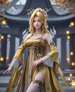 (oriental architecture, elegant decor, sophisticated style:1.1),Gazing over a raised shoulder, a hint of a smile on her lips, she emanates coyness and playful allure,(breasts:1.2),<lora:XL16完美世界黄金花女子:0.95>,1girl,yellow dress,yellow eyes,yellow eyeshadow,forehead mark,blonde hair,very long hair,hair ornament,princess half-up hairstyle with long cascading hair,wide flowing sleeves,white thighhighs,sash,, zPDXL2, score_9, score_8_up, score_7_up BREAK realistic, masterpiece,best quality, highly detailed,, zPDXL3, zPDXL2,zPDXL, zPDXLxxx, zPDXLrl,