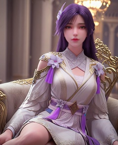 (oriental architecture, elegant decor, sophisticated style:1.1),sitting on a throne of fire,(breasts:1.2),<lora:XL完美世界云曦易容>,miss moxi,solo,white dress,sash,purple fart curtain,shawl,clothing cutout,long sleeves,shoulder cutout,brown eyes,purple hair,long hair,butterfly hair ornament,flower ornament,tassel,lips,jewelry,, zPDXL2, score_9, score_8_up, score_7_up BREAK realistic, masterpiece,best quality, highly detailed,, zPDXL3, zPDXL2,zPDXL, zPDXLxxx, zPDXLrl,