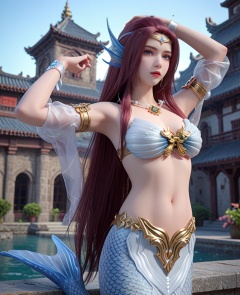 (oriental architecture, elegant decor, sophisticated style:1.1),Standing on a rooftop, arms raised, celebrating a moment of triumph,,(breasts:1.2),<lora:XL完美世界人鱼少女:0.8>,mermaid,solo,shell bikini,tail of mermaid,blue eyes,circlet,brown hair,long hair,head fins,necklace,armlet,detached sleeves of see-through,wristband,scales,, zPDXL2, score_9, score_8_up, score_7_up BREAK realistic, masterpiece,best quality, highly detailed,, zPDXL3, zPDXL2,zPDXL, zPDXLxxx, zPDXLrl,