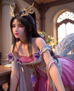(oriental architecture, elegant decor, sophisticated style:1.1),paddleboarding,huge waves,(breasts:1.2),<lora:XL完美世界天狐仙子:0.9>,miss tianhuxianzi,solo,white dress with pink minidress underneath,shawl sleeve,multilayer fart curtain,green eyes,(glittering eyeshadow:1.3),facial mark,mole under right eye,black hair,long hair,hair ornament,half tied ponytail,(hanging hair:1.2),choker,jewelry,four-foxtailed,streaked tail tip,flower ornament of purple,parted lips,, zPDXL2, score_9, score_8_up, score_7_up BREAK realistic, masterpiece,best quality, highly detailed,, zPDXL3, zPDXL2,zPDXL, zPDXLxxx, zPDXLrl,
