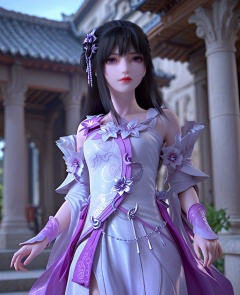 (oriental architecture, elegant decor, sophisticated style:1.1),Standing with her dress billowing and hair flying back, she faces forward with determination, as if bracing against a strong gust,(breasts:1.2),<lora:XL完美世界小月婵>,1minigirl,solo,dress of pinky white,detached sleeves,purple eyes,bangs,hair ornament,black hair,long hair,flower ornament,wristband,eyelashes,lips,, zPDXL2, score_9, score_8_up, score_7_up BREAK realistic, masterpiece,best quality, highly detailed,, zPDXL3, zPDXL2,zPDXL, zPDXLxxx, zPDXLrl,