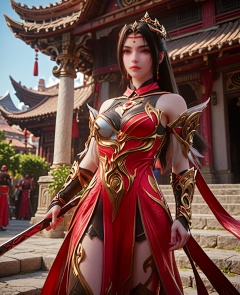 (oriental architecture, elegant decor, sophisticated style:1.1),Standing with arms crossed and a stern expression,,(breasts:1.2),<lora:XL完美世界火烁>,miss huoshuo,solo,red dress with black lining underneath,bare shoulders,vambraces,armored gloves,greave,brown eyes,forehead mark,black hair,half tied ponytai,earrings,jewelry,leather pants,clothing cutout,, zPDXL2, score_9, score_8_up, score_7_up BREAK realistic, masterpiece,best quality, highly detailed,, zPDXL3, zPDXL2,zPDXL, zPDXLxxx, zPDXLrl,