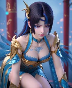 (oriental architecture, elegant decor, sophisticated style:1.1),Hands on the ground, leaning forward,,(breasts:1.2),<lora:XL16大主宰九幽:0.95>,miss jiuyou,armor,boobplate,purple eyes,braid circlet,makeup,black hair,blue streaked hair,long hair,hair ornament,sternum tattoo,rerebrace,left hand single glove with blue,blue wings cape,blue lower leg decoration,, zPDXL2, score_9, score_8_up, score_7_up BREAK realistic, masterpiece,best quality, highly detailed,, zPDXL3, zPDXL2,zPDXL, zPDXLxxx, zPDXLrl,