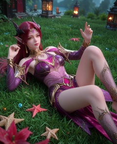 (oriental architecture, elegant decor, sophisticated style:1.1),(Lying on a grassy hill, arms spread out, looking like a starfish and enjoying the sun,:1.1),(breasts:1.2),<lora:XL百炼成神剑灵妖夜:0.9>,miss yaoye,long hair,jewelry,red hair,pointy ears,armor,earrings,horns,hair ornament,breasts,barefoot,socks,yellow eyes,lips,elf,, zPDXL2, score_9, score_8_up, score_7_up BREAK realistic, masterpiece,best quality, highly detailed,, zPDXL3, zPDXL2,zPDXL, zPDXLxxx, zPDXLrl,