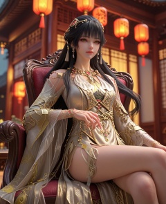 (oriental architecture, elegant decor, sophisticated style:1.1),(Sitting on a chair with legs crossed, resting chin on hand,:1.1),(breasts:1.2),<lora:XL百炼成神神国圣女白月蓉:0.95>,miss baiyuerong,black hair,jewelry,long hair,hair ornament,earrings,dress,yellow eyes,bangs,parted lips,eyelashes,teeth,, zPDXL2, score_9, score_8_up, score_7_up BREAK realistic, masterpiece,best quality, highly detailed,, zPDXL3, zPDXL2,zPDXL, zPDXLxxx, zPDXLrl,