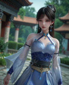 (oriental architecture, elegant decor, sophisticated style:1.1),(playing with her hair:1.1),(breasts:1.2),<lora:XL百炼成神紫极阴体小玉:0.95>,miss xiaoyu,black hair,dress,long hair,jewelry,earrings,bare shoulders,hair ornament,hair bun,blue dress,clothing cutout,sash,, zPDXL2, score_9, score_8_up, score_7_up BREAK realistic, masterpiece,best quality, highly detailed,, zPDXL3, zPDXL2,zPDXL, zPDXLxxx, zPDXLrl,