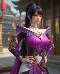 (oriental architecture, elegant decor, sophisticated style:1.1),(Hands on hips, facing the camera,:1.1),(breasts:1.2),<lora:XL百炼成神莫雨馨:0.95>,miss moyuxin,black hair,jewelry,mole,ponytail,earrings,armor,long hair,purple armor,bangs,large breasts,, zPDXL2, score_9, score_8_up, score_7_up BREAK realistic, masterpiece,best quality, highly detailed,, zPDXL3, zPDXL2,zPDXL, zPDXLxxx, zPDXLrl,
