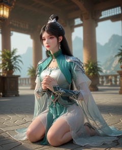 (oriental architecture, elegant decor, sophisticated style:1.1),(Kneeling on the ground, hands clasped in prayer, expressing a moment of gratitude and reflection,:1.1),(breasts:1.2),<lora:XL百炼成神路人欣欣:0.95>,miss xinxin,black hair,jewelry,dress,earrings,long hair,hair ornament,hair bun,necklace,green dress,brown eye,, zPDXL2, score_9, score_8_up, score_7_up BREAK realistic, masterpiece,best quality, highly detailed,, zPDXL3, zPDXL2,zPDXL, zPDXLxxx, zPDXLrl,