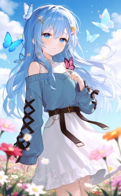 masterpiece,absurdres,best quality,loli,petite,high quality,//,1girl,butterfly,bug,blue_butterfly,solo,flower,cross-laced_sleeves,blue_eyes,blue_hair,long_hair,flower_field,skirt,looking_at_viewer,belt,white_flower,outdoors,cross-laced_clothes,long_sleeves,blue_sweater,field,off_shoulder,off-shoulder_sweater,cloud,hair_ornament,yellow_flower,blurry_foreground,pink_flower,sweater,sky,watermark,parted_lips,butterfly_on_hand,black_belt,shirt,blurry,white_skirt,hair_between_eyes,floating_hair,happy_birthday,bare_shoulders,red_flower,orange_flower,belt_buckle,hand_up,day,blue_sky,hair_flower,//,<lora:FymriE——【noob】hans:1>,